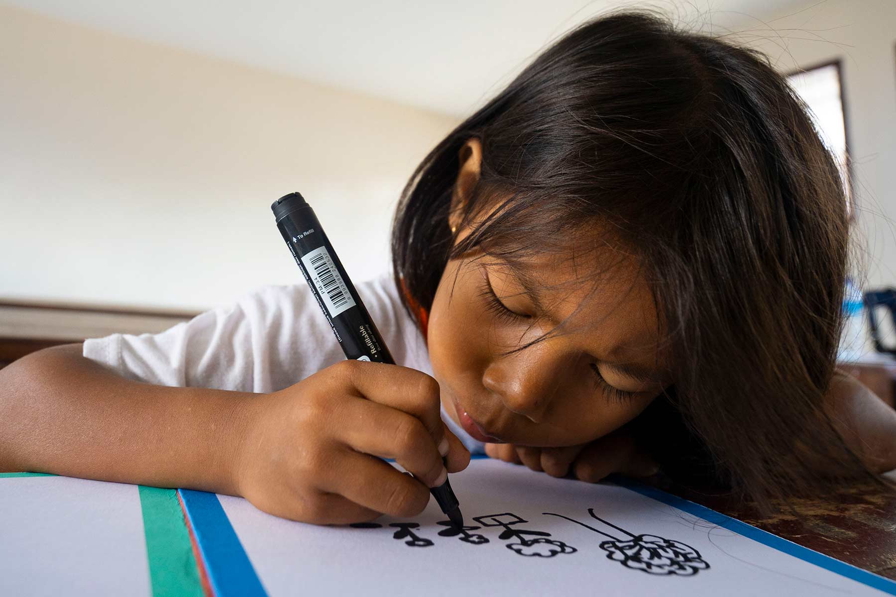 The school is located on Gili Asahan. Loosely translated this means ‘makes you feel at home’. The island is named after its warming atmosphere, which is created by its magnificent surroundings and welcoming community. Therefore we chose this concept as our overall theme for our upcoming collabs by asking the kids to draw about their island. Their drawings provided a rich and diverse exploration of the children's lives on Gili Asahan, showcasing the many facets that contribute to the feeling of home and connection with the island.