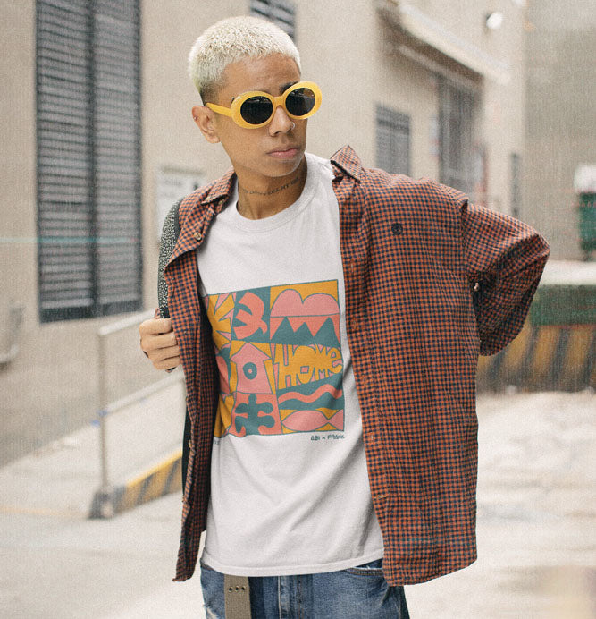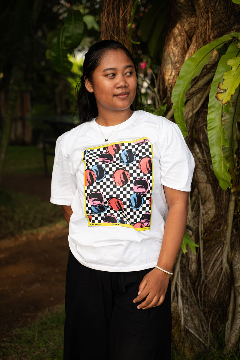 Each month, one (street)artist collabs with an Indonesian school kid on the design of two tees, a tote bag and a sweater. All proceeds benefit the child's school. Check out our latest drop of the month!